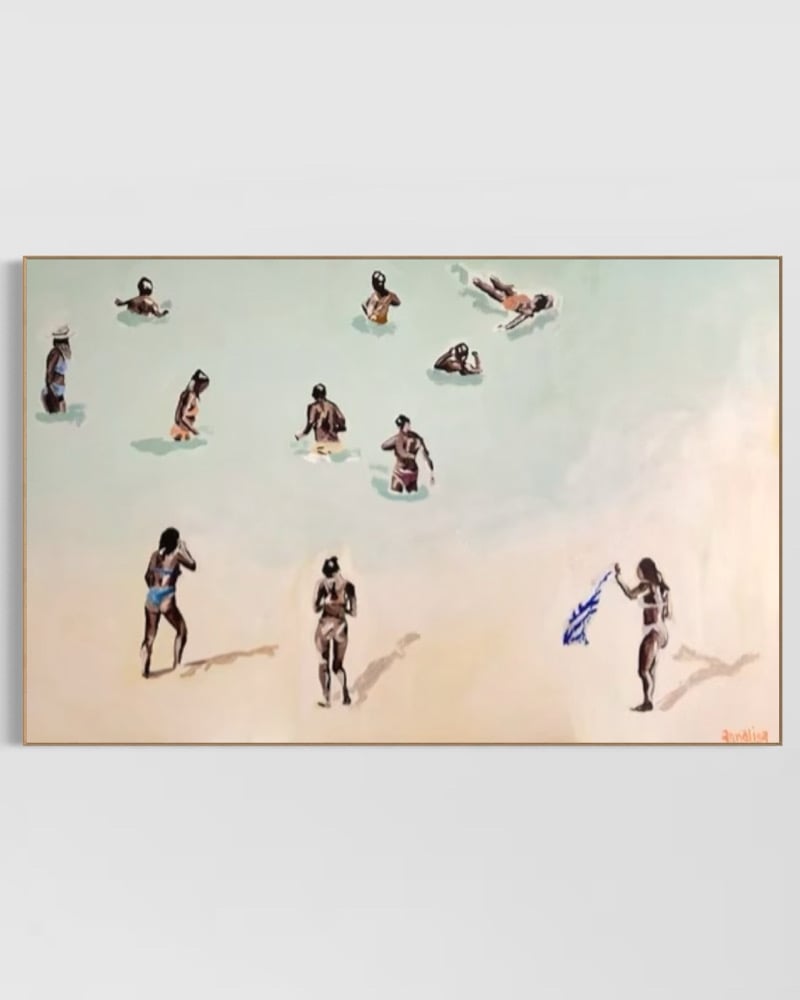 Painted with restraint and luminous subtlety, the work holds the pared-back palette that defines Annalisa’s practice: soft sea-blues, pale sand, and shadowed skin tones dissolving into air and salt.